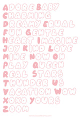 a like adore - b like baby - c like charming - d like dreamy - e like equal - f like fun - g like gentle - h like heart - i like imagine - j like joy - k like kind - l like love - m like mine - n like now - o like on - p like play - q like queen - r like real - s like stars - t like thunder - u like us - v like vacation - w like wow - x like xoxo - y like yours - z like zoom